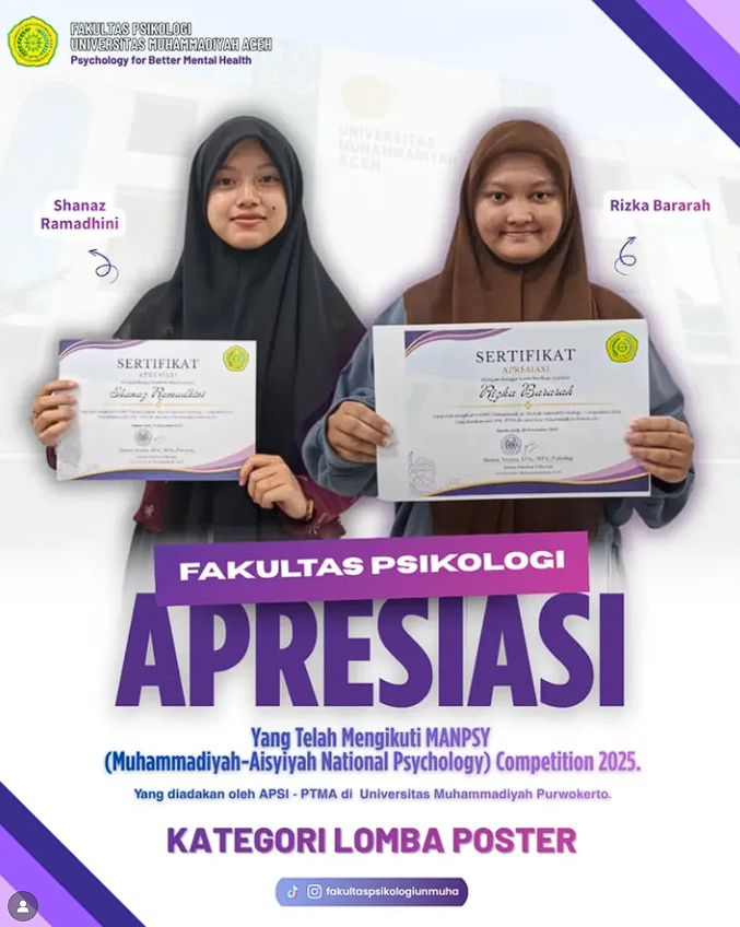 Sebagai bentuk apresiasi, Fakultas Psikologi Universitas Muhammadiyah Aceh memberikan sertifikat apresiasi kepada Shanaz Ramadhini dan Rizka Bararah Yang telah mengikuti MANPSY (Muhammadiyah-Aisyiyah National Psychology) Competition 2025 Pada Kategori Lomba Poster.