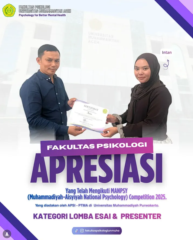Yang telah mengikuti MANPSY (Muhammadiyah-Aisyiyah National Psychology) Competition 2025 Pada Kategori Lomba Esai dan Presenter. Yang diadakan oleh APSI – PTMA di Universitas Muhammadiyah Purwokerto.