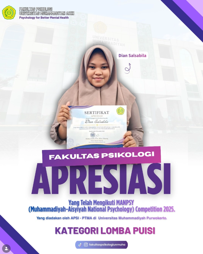 Yang telah mengikuti MANPSY (Muhammadiyah-Aisyiyah National Psychology) Competition 2025 Pada Kategori Lomba Puisi. Yang diadakan oleh APSI – PTMA di Universitas Muhammadiyah Purwokerto.