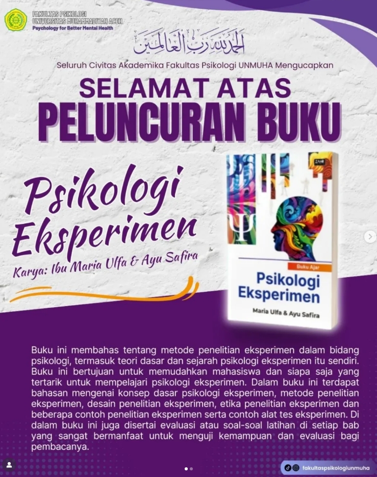 Segenap Civitas Akademika Fakultas Psikologi Universitas Muhammadiyah Aceh mengucapkan “Selamat atas Peluncuran Buku Psikologi Eksperimen (@maria_ulfa_hs dan @ayu.safira.146 ) dan Psikologi Keluarga (@maria_ulfa_hs @hanna.amalia.rahman @umrohhayail @barmawi.psi )”